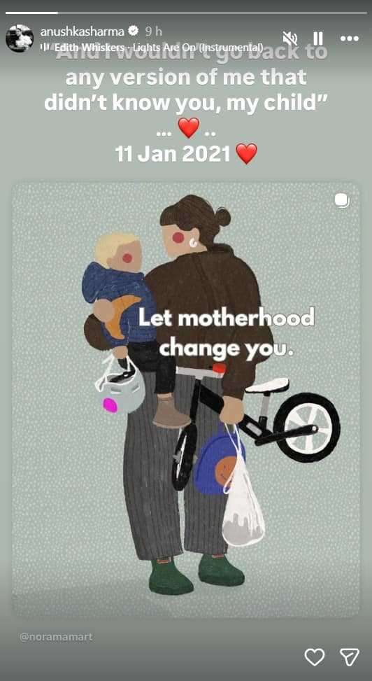 11 जनवरी 2026 को अनुष्का शर्मा और विराट कोहली की बेटी वामिका 5 साल की हो गई. बेटी के बर्थडे पर एक्ट्रेस ने इंस्टाग्राम स्टोरी पर एक पोस्ट को रीशेयर किया है जो मदरहुड की खूबसूरत जर्नी को जाहिर करता है. इस पोस्ट में लिखा गया, 'मां बनना आपको उन तरीकों से बदल देता है जो मायने रखते हैं. आपको पहले जैसा रहने की जरूरत नहीं है.' पोस्ट में लिखा गया कि मदरहुड को खुद को बदलने दें.
