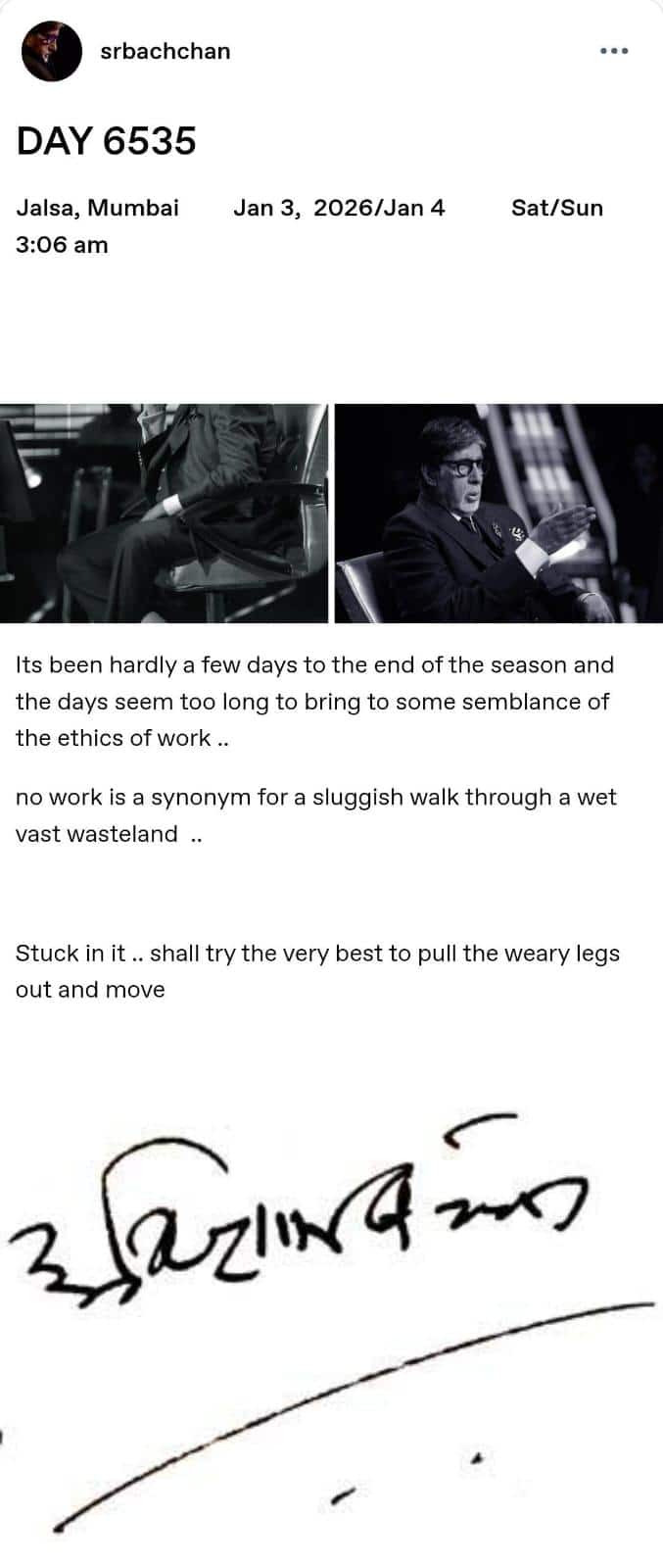 अमिताभ बच्चन ने अपने ब्लॉग में शो से जुड़े अनुभव साझा करते हुए लिखा, 'शो जैसे-जैसे खत्म होने के करीब आ रहा है, मुझे समय धीमा महसूस होने लगा है. काम न होने की वजह से एक अजीब-सी सुस्ती और बेचैनी मेरे मन में उठ रही है.' उन्होंने कहा, 'बिना काम के दिन जैसे लंबा और बोझिल लगने लगता है और यह अनुभव कभी-कभी थकान और तनाव भरा होता है.'