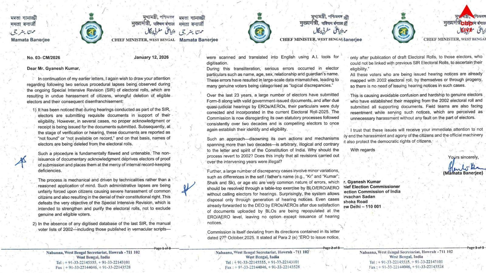 কলকাতা:  পত্র যুদ্ধ অব্যাহত, SIR আবহে মুখ্য নির্বাচন কমিশনার জ্ঞানেশ কুমারকে পঞ্চম চিঠি পাঠালেন মুখ্যমন্ত্রী মমতা বন্দ্যোপাধ্যায়। জ্ঞানেশ কুমারকে লেখা চিঠিতে অভিযোগ তুলে তিনি জানিয়েছেন, 'যোগ্যতা প্রমাণের জন্য উপযুক্ত নথি জমা দিলেও, তার প্রাপ্তিস্বীকার করা হচ্ছে না। পরীক্ষার সময় এই সমস্ত নথি 'নট ফাউন্ড' বলে চিহ্নিত হচ্ছে। এরপর এই ভোটারদের নাম তালিকা থেকে মুছে দেওয়া হচ্ছে। এই পদ্ধতিতেই গলদ আছে।এই পদ্ধতি যান্ত্রিক এবং এর মধ্যে মাথা খাটানোর কোনও ব্যাপার নেই।'