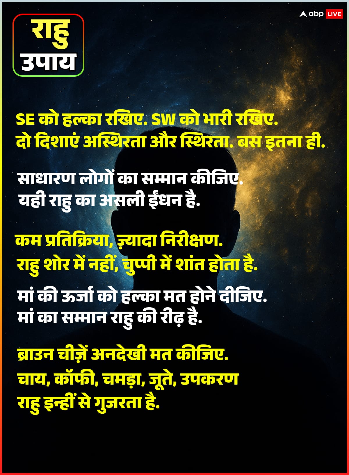 राहु पितरों और साधारण लोगों से भी गहरा जुड़ा है. मजदूर, ड्राइवर, सफाई कर्मी ये राहु की शुद्ध ऊर्जा हैं. इनका अनादर राहु के पूरे सिस्टम को उलझा देता है. पितरों का सम्मान, SW की स्वच्छता और सामान्य लोगों के प्रति विनम्रता राहु को स्थिर करती है.